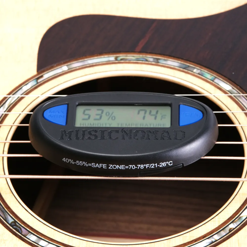 Soundhole Level: For acoustic guitars, the most critical micro-climate is inside the body. Having a hygrometer in the soundhole, like the MusicNomad Hone, provides the most accurate reading of the wood’s actual environment. The Hone also shows you the minimum and maximum temperature and humidity it has measured, letting you know of changes when you might not be seeing throughout the day.