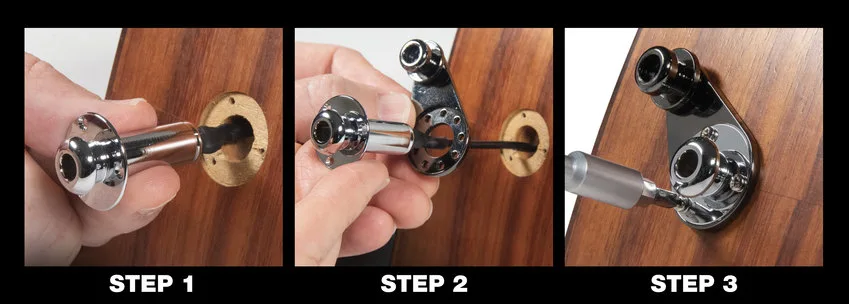Determine which button you want to use: Strap Lock Adapter or QuickSecure™ button and make sure in place. (Step 1) The output jack must first be unplugged from the internal preamp, unscrewed and removed. (Step 2) Run the jack cable through the center opening of Acousti-Lok and back into the guitar, felt side against the guitar. The jack mounting plate rests in the recessed portion of Acousti-Lok and the multiple mounting screw holes allow you rotate to the best position. The strap button should be aimed upward or angled slightly back toward your body when the guitar is in playing position. (Step 3) Run the same screws that held the jack in place back through the jack and Acousti-Lok mounting holes and tighten. Plug jack back into the internal preamp and secure wire in place.