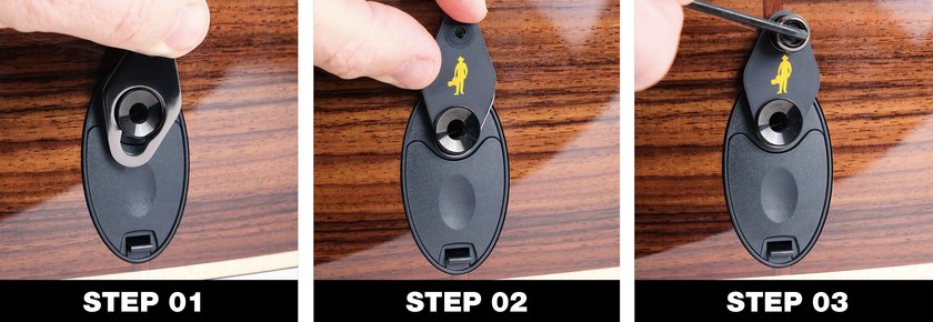 Using the 7/64” Allen Key provided unscrew the machine screw in the strap lock button to separate the parts. Place the keyhole ring over the end pin and slide it to the narrow end of the opening. Slip the plastic cover plate into place with its forked end wedged under the strap lock button flange and line up the screw holes. Reinstall the strap lock button using the Allen key and firmly tighten. Acousti-Lok does not block the battery cartridge. Will not fit TAYLOR® Guitars original AA battery powered EXPRESSION SYSTEM®. If the plastic cover plate won’t slip into place, the strap pin flange may be slightly bent. Rotate the Acousti-Lok to try it from different directions. If necessary, sand the underside slightly on a flat surface just until it’s thin enough to slip into place.