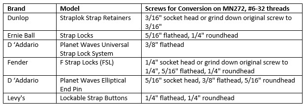 It’s easy to convert Acousti-Lok to be used with DUNLOP® strap locks, but you will need a shorter screw. Simply loosen the screw holding the Acousti-Lok strap button in place and replace it with the DUNLOP® strap button.